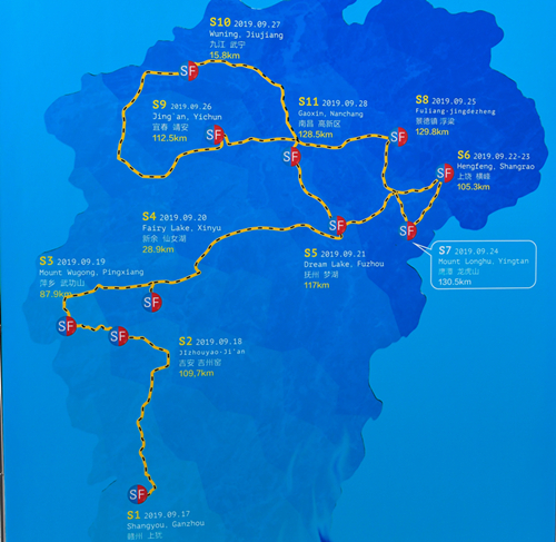 本屆環(huán)鄱賽將于9月17日至28日在全省11個設區(qū)市舉行,賽事總獎金25萬美元。參賽隊伍22支,參賽選手及領隊、教練員220人左右,全部由職業(yè)隊、國家隊及省隊組成。十一個分賽站為:贛州市上猶縣(17日)、吉安市吉安縣(18日)、萍鄉(xiāng)市武功山(19日)、新余市仙女湖(20日)、撫州市夢湖(21日)、上饒市橫峰縣(22日比賽、23日休息)、鷹潭市龍虎山(24日)、景德鎮(zhèn)市浮梁縣(25日)、宜春市靖安縣(26日)、九江市武寧縣(27日)、南昌市高新區(qū)(28日),大賽總賽程1056公里,轉場里程1788公里。11個賽站共設置25個途中沖刺點、10個爬坡點。